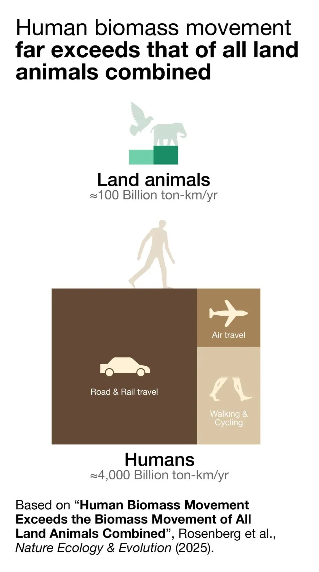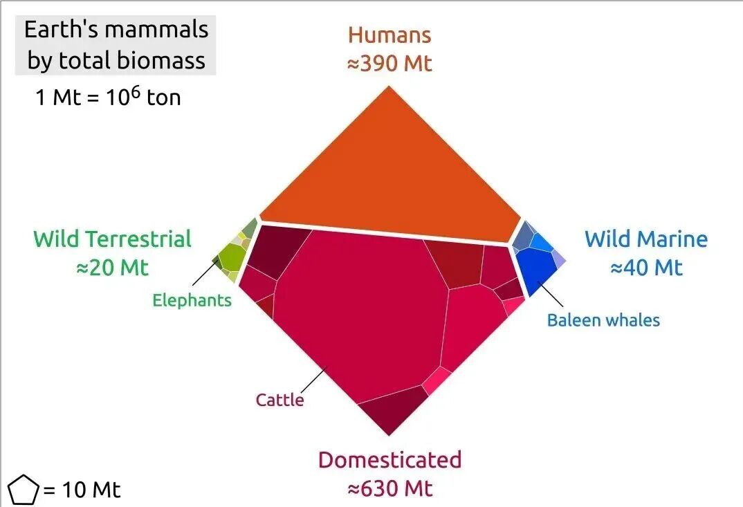 本周发表在《自然·生态与演化》(Nature Ecology & Evolution)的一项研究中,研究团队分析了已有科学文献和数百个数据源,发现人类的生物量迁移可能达到所有陆地动物总和的40倍。而同日,另一项发表于《自然·通讯》(Nature Communications)的论文整合多种数据集和评估推算出,自1850年来,人类和家养哺乳动物(如牛和绵羊)生物量增长近5倍,而野生哺乳动物的生物量总和锐减逾半。仅海洋哺乳动物生物量就减少了70%,主要源于较大物种的衰退,如蓝鲸、座头鲸、长须鲸和抹香鲸等。